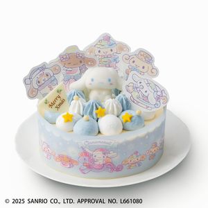4号 直径約12cm 数量限定 別添:マシュマロ1個、ピックシート1枚、オリジナルステッカー1枚 チーズムースの土台に、雲をイメージしたシナモロールカラーのクリームを絞ったオリジナルケーキ。シナモロールはマシュマロでモチモチふわふわ食感です。 特定原材料/小麦・卵・乳成分