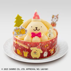 4号 直径約12cm 数量限定 別添:チョコレートの帽子、オリジナルステッカシール2枚 大人気キャラクターのポムポムプリンの世界観をクリスマスケーキで表現しました。プリン風味クリームに合わせたカラメルシロップがアクセントです。 特定原材料/小麦・卵・乳成分