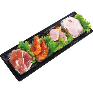 1パック豚のロースト自家製ジュレのせ、鴨のパストラミトマトペンネサラダ添え、ソフトシェルシュリンプスウィートチリソース和え、ポテトサラダ生ハム添え 特定原材料/小麦・卵・乳成分・えび