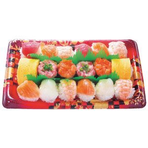 18貫 約2人前 まぐろ・サーモン・えび・玉子・いか・ディップ寿司2種(まぐろたたき+かっぱ巻・サーモン+かっぱ巻) お子様にもおすすめ、一口サイズのかわいらしいお寿司。 特定原材料/小麦・卵・えび