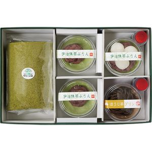 贅沢抹茶ロールケーキ×1、宇治抹茶プリン95g×2、宇治抹茶白玉プリン115g×1、宇治ほうじ茶プリン95g×1、宇治抹茶みつ15g×1、黒みつ15g×1 <賞味期限:14日>