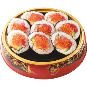 8切れ 本まぐろ中とろ・サーモン・真鯛・天然車えび・ずわいがに・活〆煮穴子・数の子・玉子焼・きゅうり・いくら醤油漬 特定原材料/小麦・卵・乳成分・えび・かに ※本まぐろ中とろにずわいがに、天然車えびをはじめとした厳選素材にいくらがたっぷり。贅を味わう極みの海鮮太巻です。